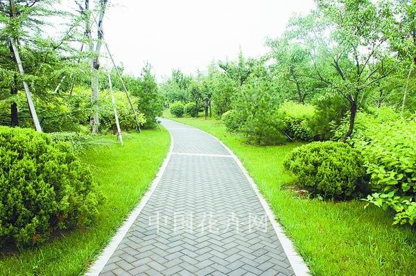 而在道路十字路口的節(jié)點(diǎn)處,則主要是用10厘米×10厘米的小花崗巖鋪地,鋪出來的路面整潔、平坦,看似簡單,實(shí)則對施工技術(shù)要求相當(dāng)高。草坪中的地面鋪裝,則采用花崗巖汀步,用錯(cuò)縫鋪裝法,兩塊花崗巖之間用草皮鑲嵌,就像給每塊花崗巖鑲了一道綠邊,與旁邊的草坪和諧地融為一體。貫穿整個(gè)工程的游憩步道,全部采用“人字形”的鋪裝方法,中間用透水磚、兩邊以花崗巖鑲邊,透水磚價(jià)格不高,用以鑲邊的花崗巖是利用了鋪裝中剩余的邊料,雖然用料簡單,但通過對技術(shù)的嚴(yán)格要求,鋪出的路面整潔而不失韻味,是一種實(shí)用、環(huán)保、節(jié)約的做法。
