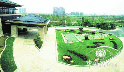 如2號樓大廳門前,在大面積草坪上,選用紅花檵木、金邊胡頹子、茶梅等一些小毛球,用中國書法的用筆法則,十分簡潔地“書寫”出點、橫、豎、鉤、提、撇、短撇、捺,即代表中國書法中筆畫大體的“永”字八法,這種匠心獨運的植物配置,將園林造景手法與中國書法藝術(shù)完美配合,在園林景觀中融入了中國深厚的文化底蘊,景觀效果令人耳目一新,使酒店整體景觀品位得到提升,是中國傳統(tǒng)園林造景手法的典型運用。