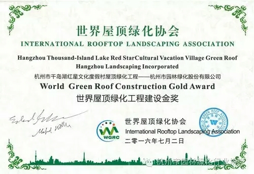 近日,在云南昆明召開的2016世界生態(tài)城市與屋頂綠化大會(huì)上,協(xié)會(huì)會(huì)員企業(yè)——杭州市園林綠化股份有限公司承建的杭州市千島湖紅星文化度假村屋頂綠化工程榮獲“世界屋頂綠化工程建設(shè)金獎(jiǎng)”。