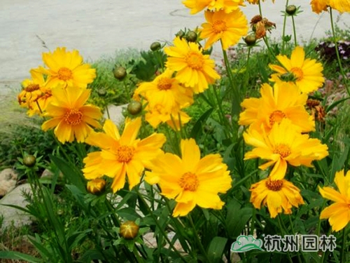 金雞菊,葉片多對生,稀互生、全緣、淺裂或切裂?;▎紊蚴鑸A錐花序,總苞兩列,每列3枚,基部合生。舌狀花1列,寬舌狀,呈黃、棕或粉色。管狀花黃色至褐色。既耐寒又耐干旱,pH 5-7都可以種植,很容易栽培。也常用于綠化栽培。特點是繁殖力極強(qiáng),有時成了半野化種。除了代表性的黃色外,還有重瓣等品種。