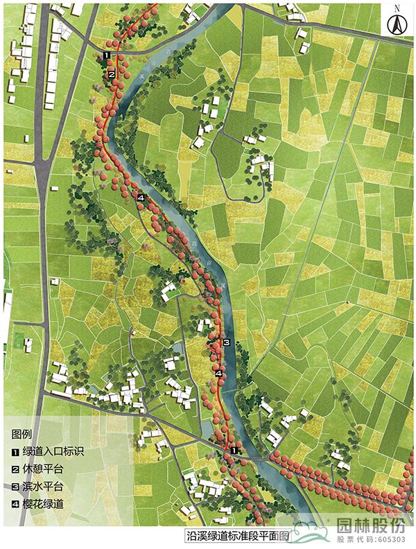 沿溪綠道為櫻花環(huán)中濱河段落,該標準段長度為730m,總長2590m。以春季櫻花為主題,打造浪漫的濱水慢行系統(tǒng),沿線打造休憩空間,設置休憩設施,并在入口處設計特色標識,成為村民通行休閑健身的浪漫步道。