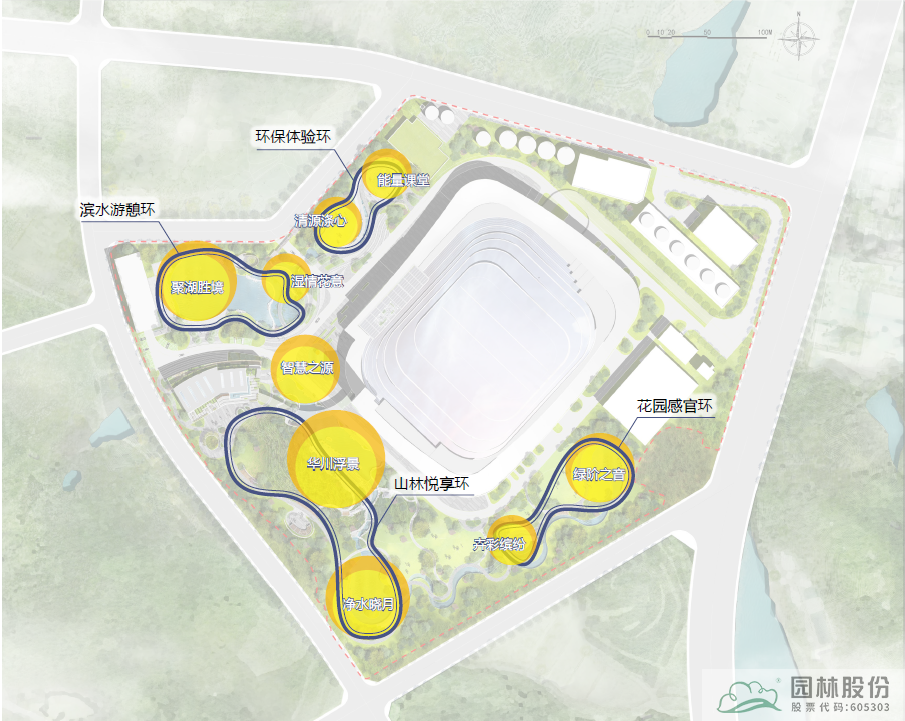 四環(huán):環(huán)保體驗環(huán)、濱水游憩環(huán)、山林悅享環(huán)、花園感官環(huán);